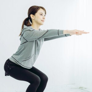 ちょっとした時間に10回×2セットのスクワットを取り入れます。太もも・お尻の大きな筋肉を使うので、効率良く代謝アップにつながります。